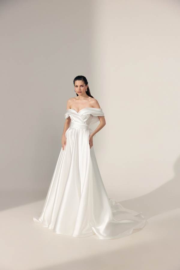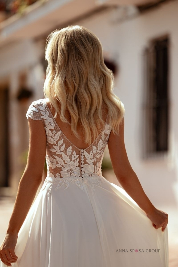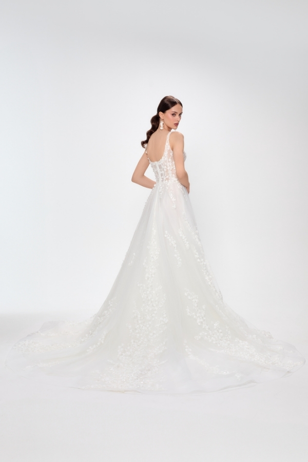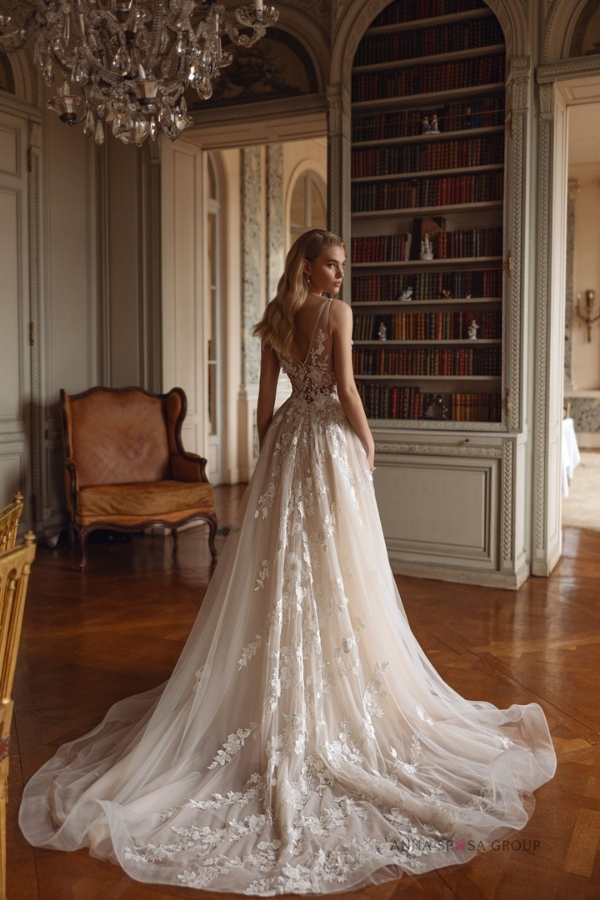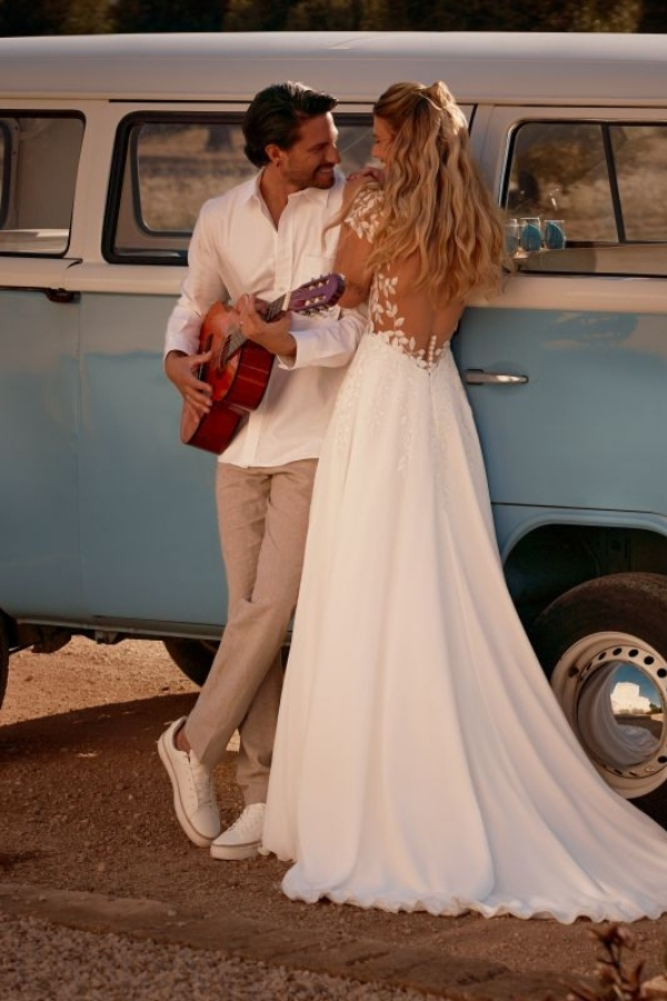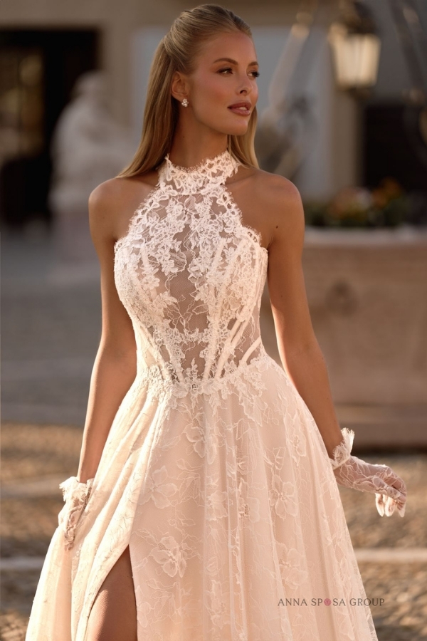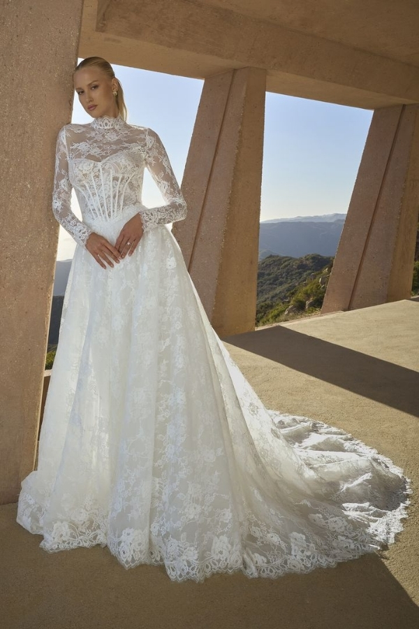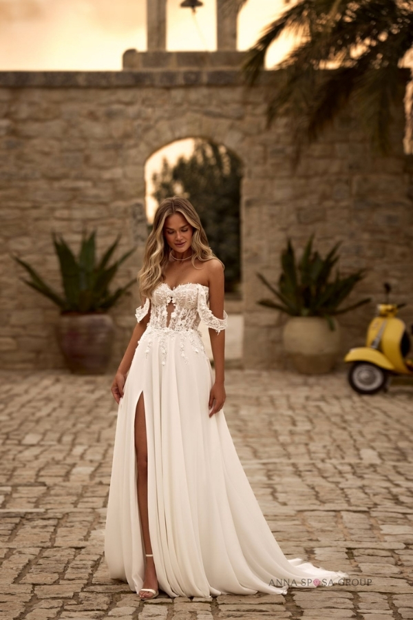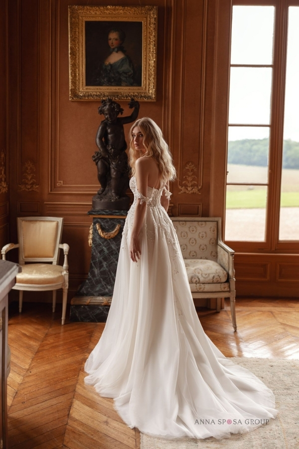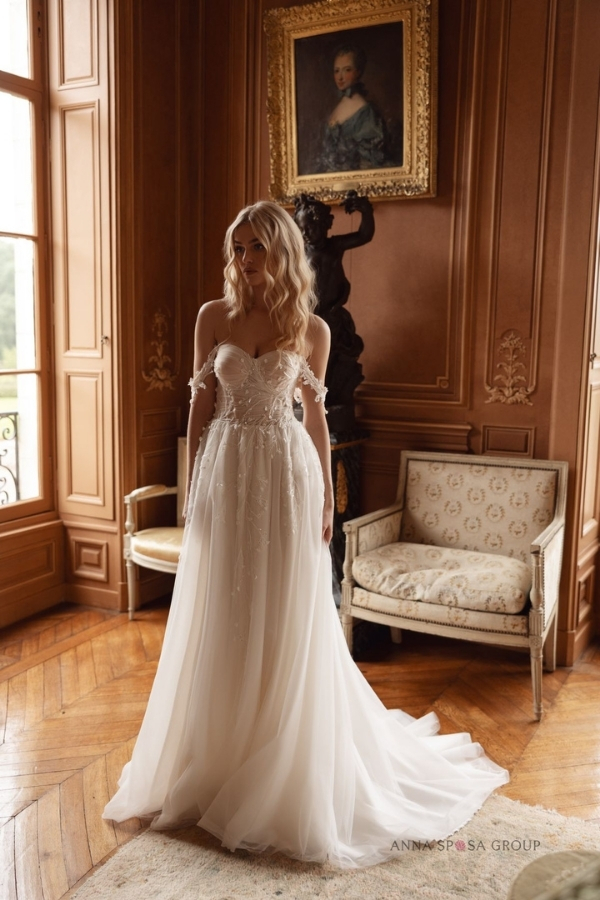 Diese Form zeichnet sich durch ein eng anliegendes Oberteil aus, das ab der Taille allmählich weiter ausgestellt wird und einen A-förmigen Rock bildet. Durch die betonte Taille und den fließenden Rock verleiht die A-Linie dem Brautkleid eine romantische und zeitlose Note.