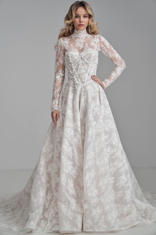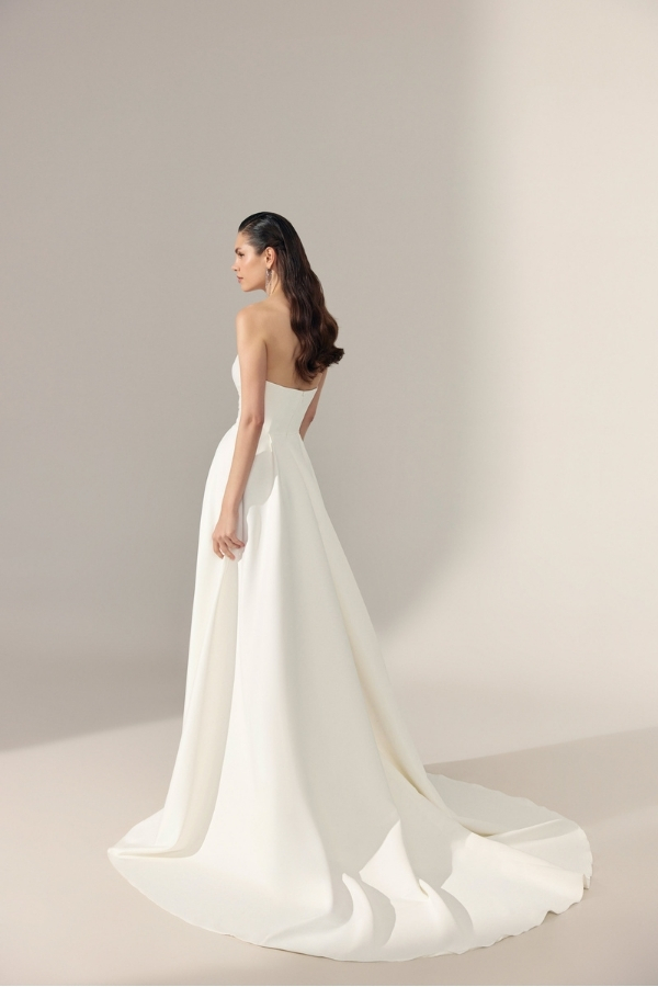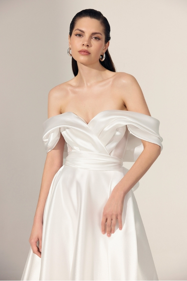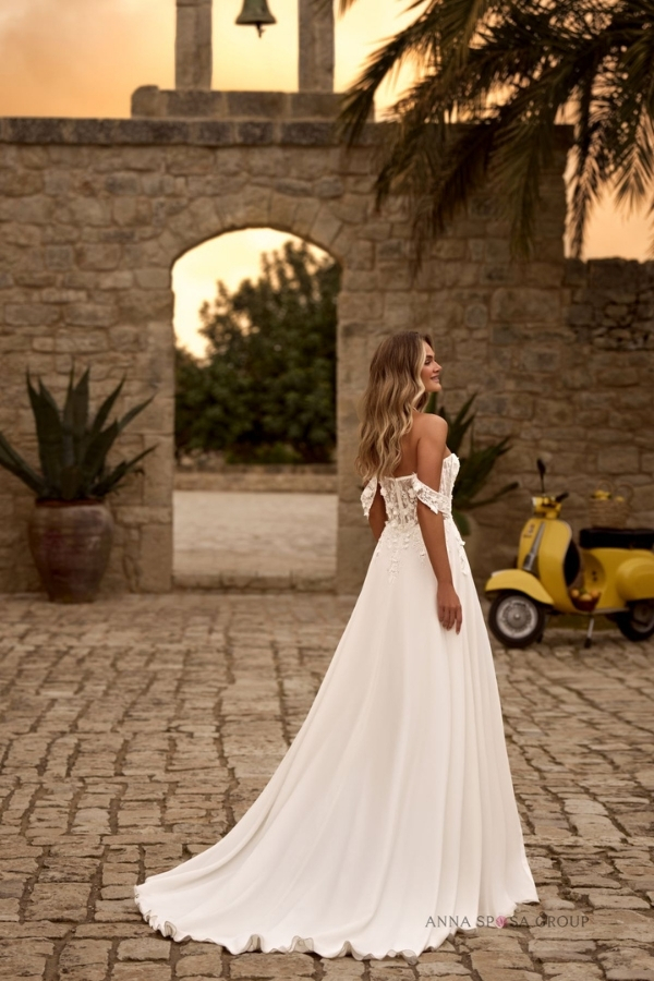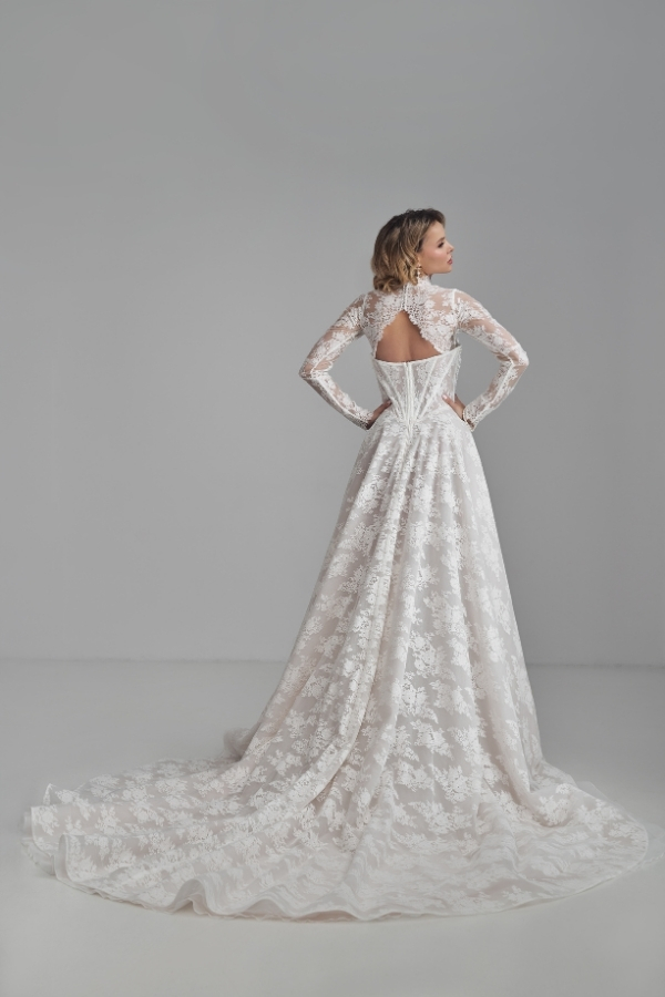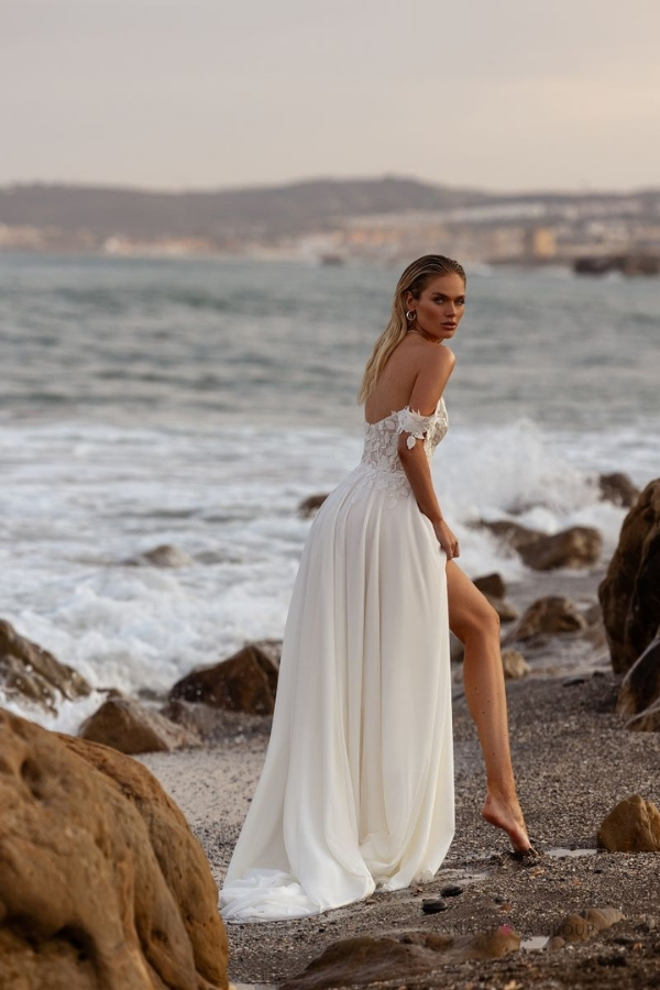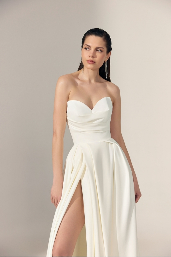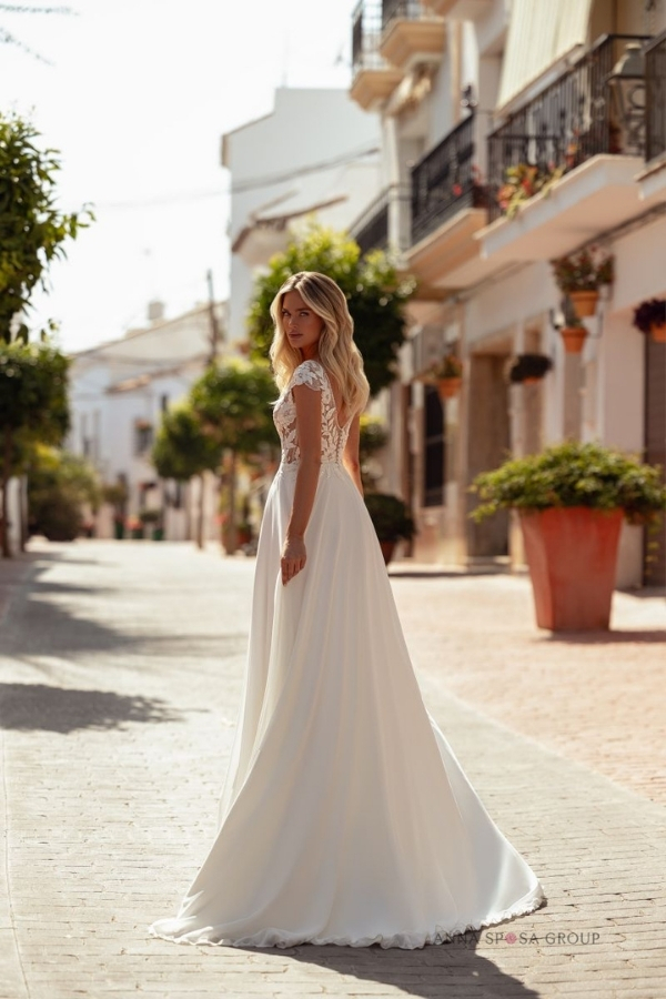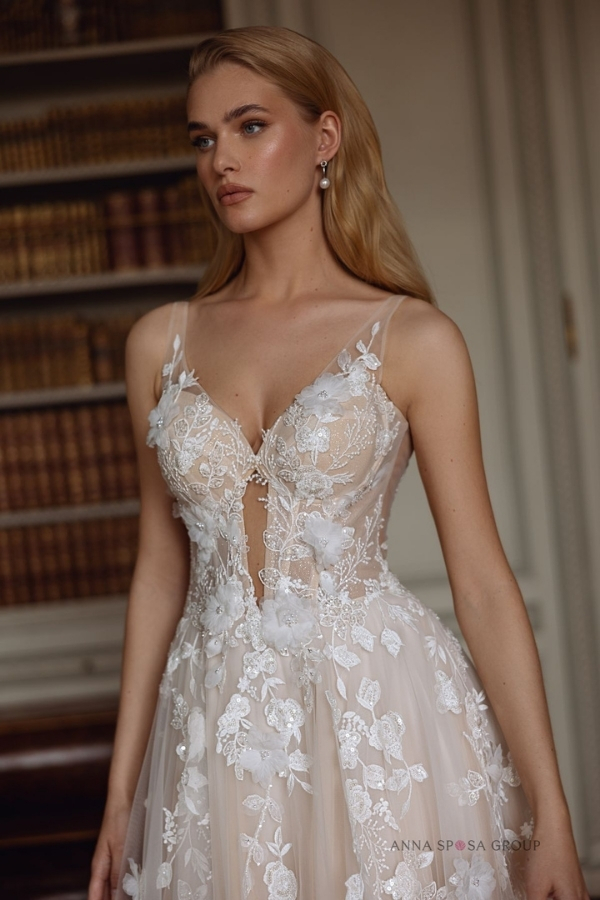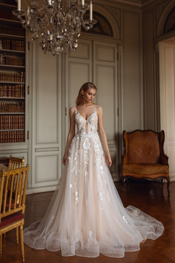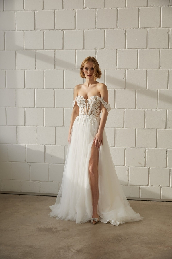 Diese Form zeichnet sich durch ein eng anliegendes Oberteil aus, das ab der Taille allmählich weiter ausgestellt wird und einen A-förmigen Rock bildet. Durch die betonte Taille und den fließenden Rock verleiht die A-Linie dem Brautkleid eine romantische und zeitlose Note.