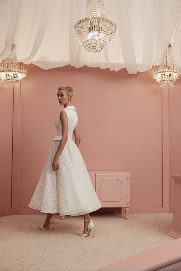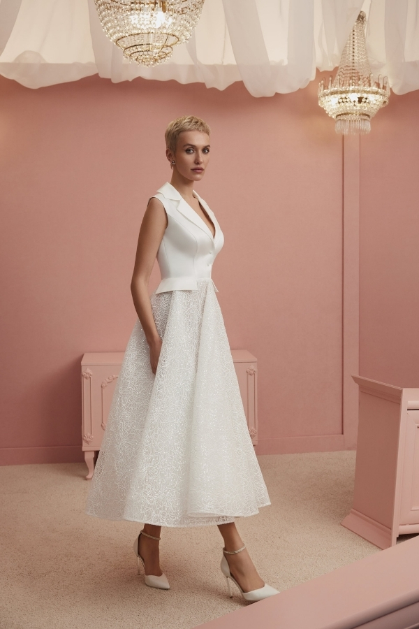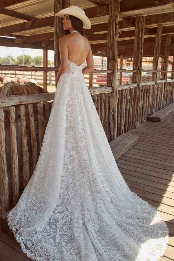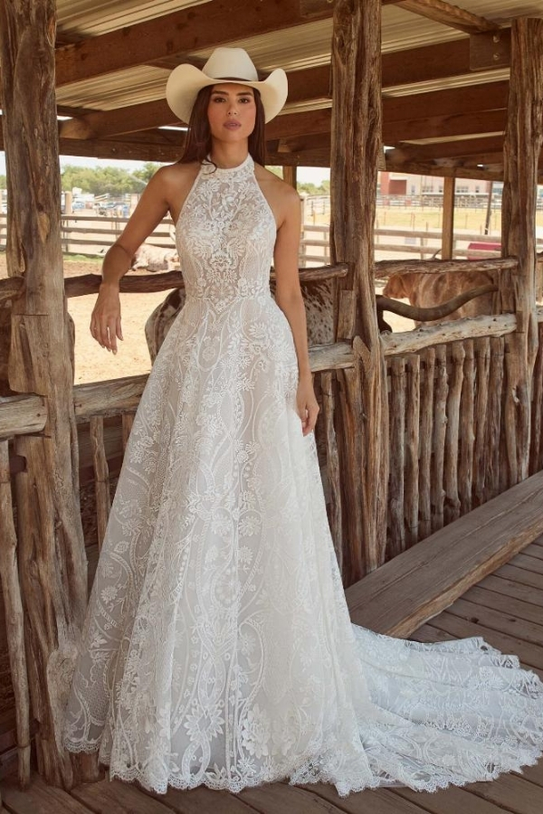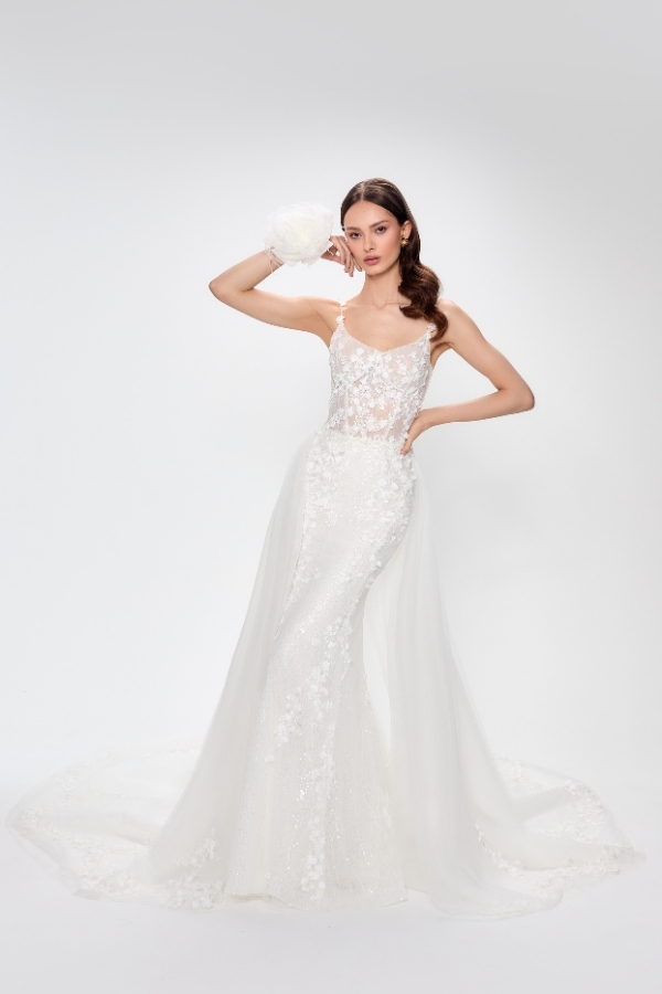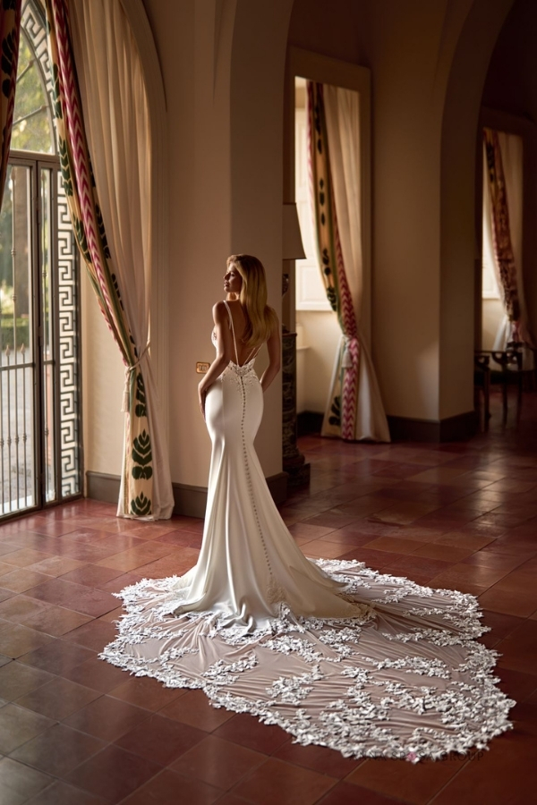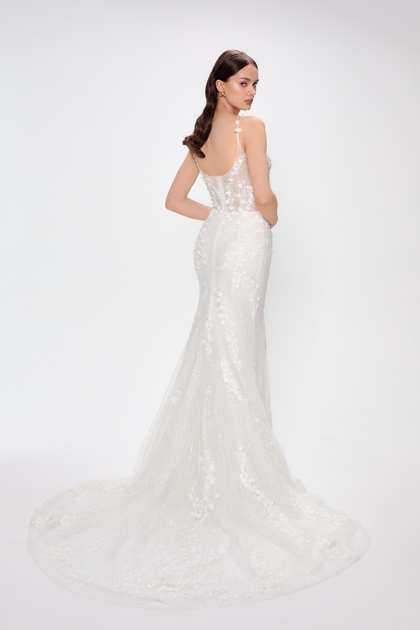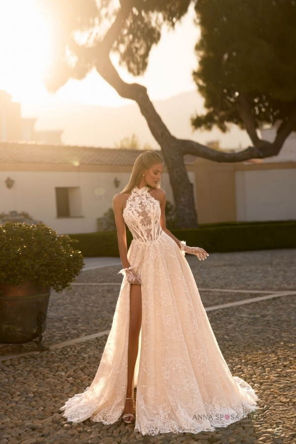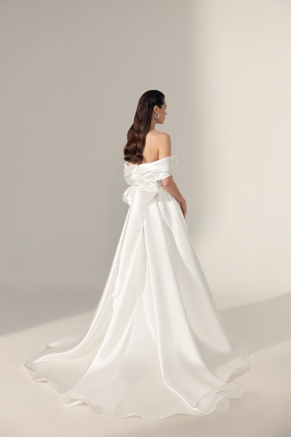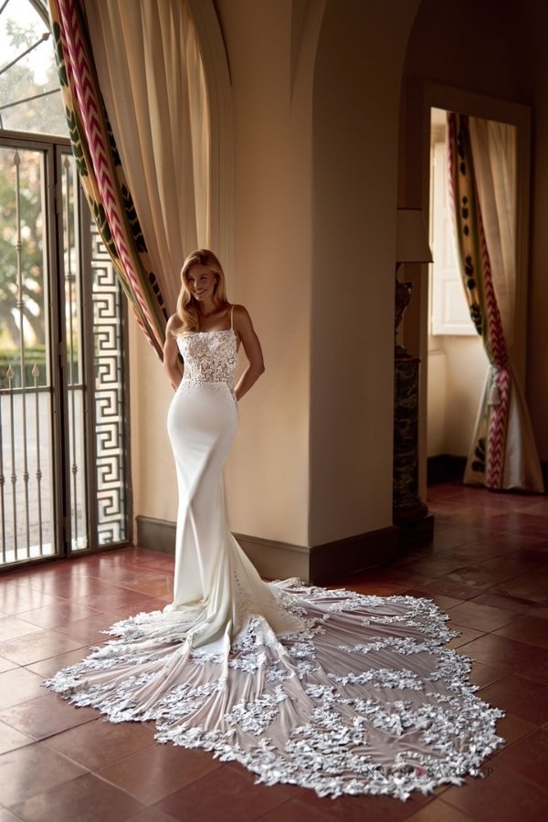 Diese Form zeichnet sich durch ein eng anliegendes Oberteil aus, das ab der Taille allmählich weiter ausgestellt wird und einen A-förmigen Rock bildet. Durch die betonte Taille und den fließenden Rock verleiht die A-Linie dem Brautkleid eine romantische und zeitlose Note.